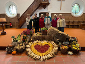 Die Kirche war liebevoll mit Erntegaben aus der Region geschmückt – Äpfel, Kartoffeln, Maiskolben, Tomaten, verschiedenes Gemüse und selbstgebackene Zöpfe.
