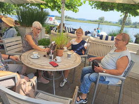 Im Anschluss ging es mit dem Schiff in Richtung Schaffhausen. Die zweieinhalbstündige Fahrt bot allen eine herrliche Aussicht, sowohl von oben als auch von unten. Während des Mittagessens konnte man die Aussicht genießen und entspannen. In Schaffhausen folgte ein zweistündiger Aufenthalt. Viele nutzten die Zeit, um eine feine Glace